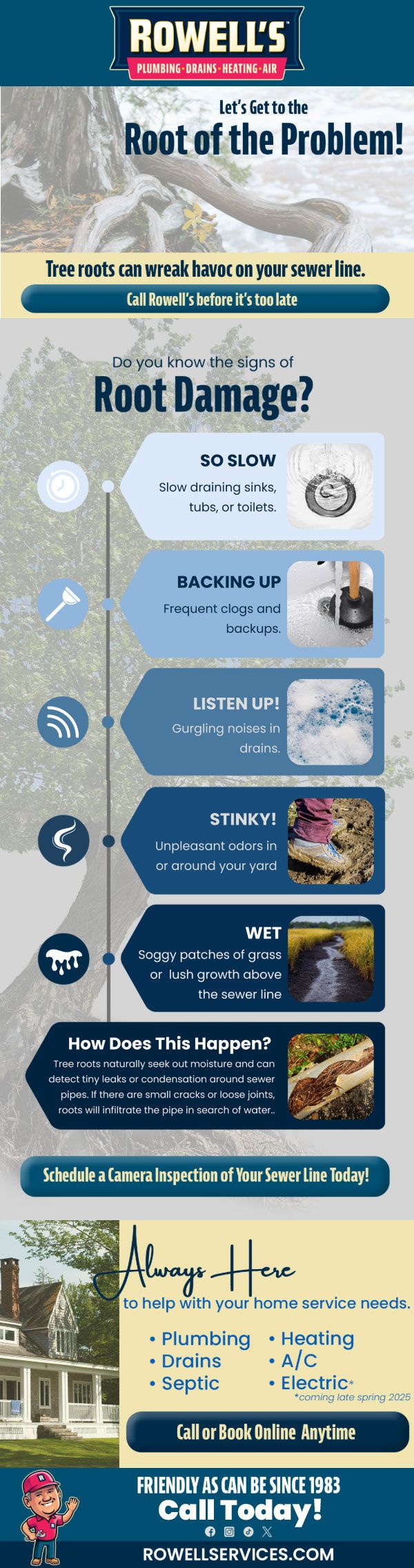 Tree roots can wreak havoc on your sewer line. Call Rowell's before it's too late